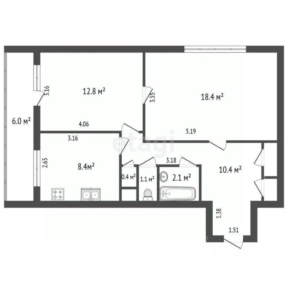 Продается 2/3 доли в светлой двухкомнатной квартире площадью 54,9 м²
