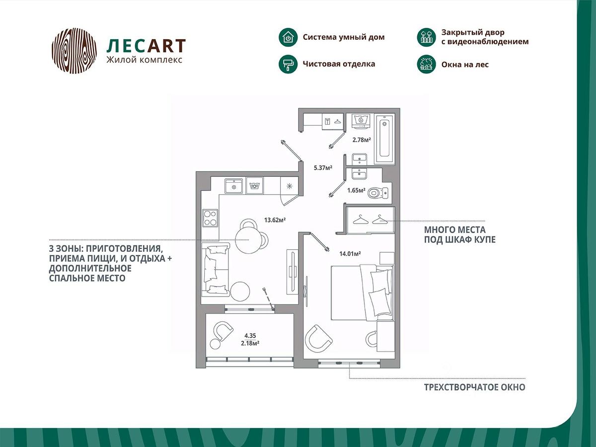 Продаётся 1-комнатная квартира 259, общей площадью 39.61 кв.м., на 12. Дом комфорт-класса, 12 этажей, в окружении леса и малоэтажной застройки. Проект с умным домом. Передача квартир в апреле 2026г.