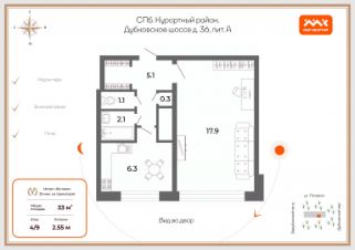 Общая площадь квартиры 33 м: