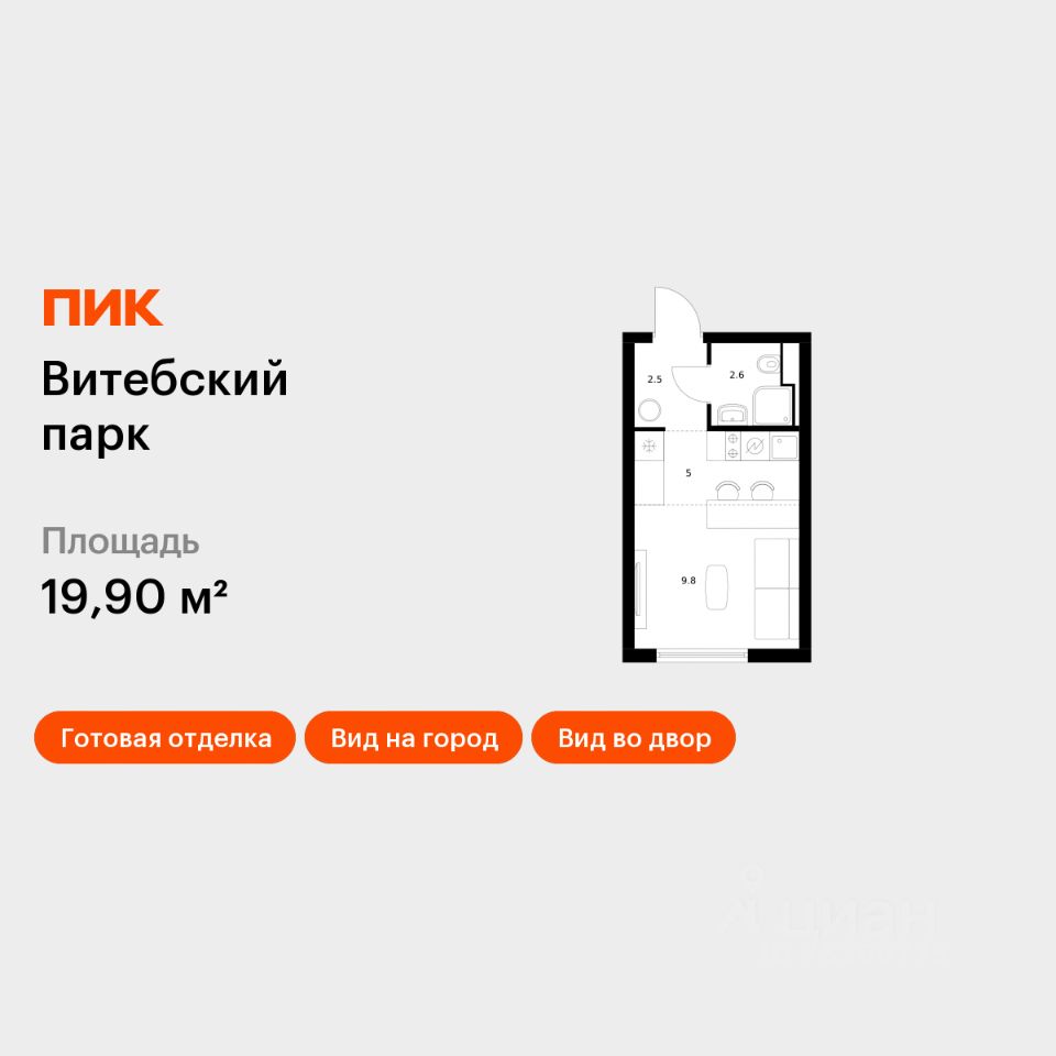 Продаётся квартира-студия площадью 19,9 кв.м на 3 этаже 12 этажного дома (Корпус 7, Секция 3) проекта ПИК Витебский парк. Светлый просторный подъезд на уровне земли, функциональная планировка, большие окна, c отделкой.