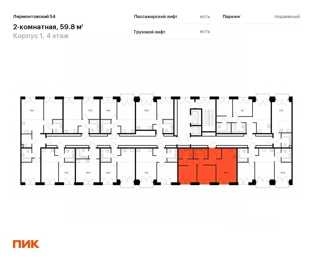 Продаётся 2-комн. квартира площадью 59,2 кв.м на 4 этаже 9 этажного дома (Корпус 1, Секция 6) проекта ПИК Лермонтовский 54. Светлый просторный подъезд на уровне земли, функциональная планировка, большие окна, предчистовая отделка.