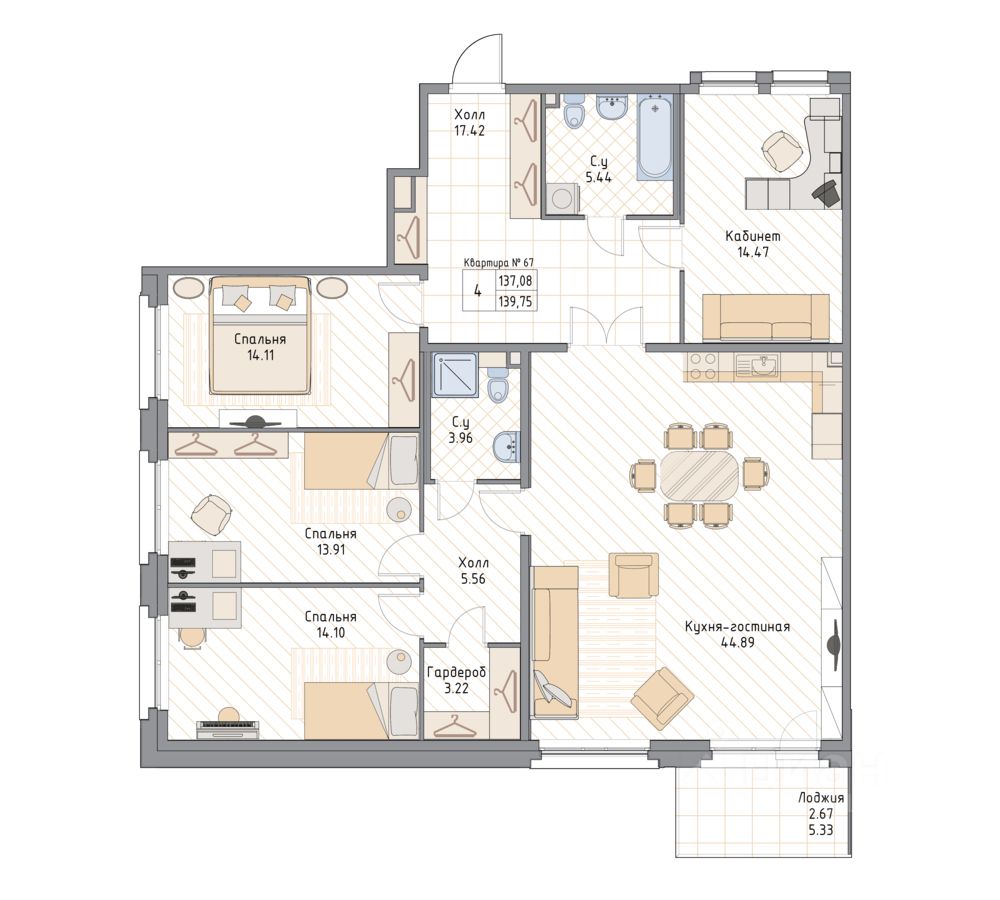 Общая планировка: квартира включает четыре изолированные комнаты, просторную кухню-гостиную площадью 45 м², два совмещенных санузла, гардеробную комнату, а также лоджию с выходом из кухни.