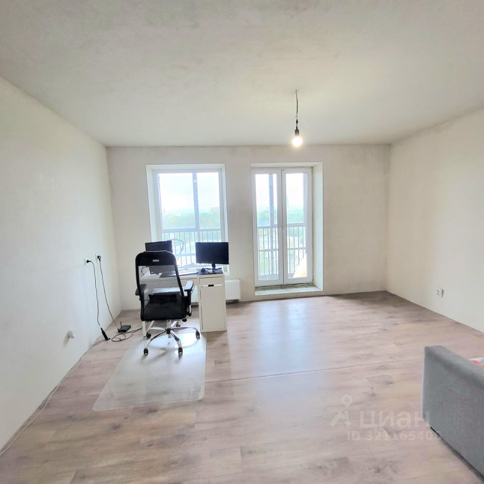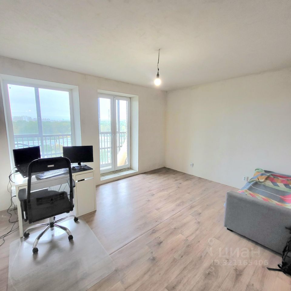 - В комнате два окна, пространство можно удачно зонировать на зону отдыха и кухни.
