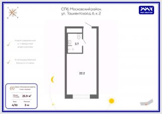 Апартамент расположен на 4-м этаже, общая площадь 25.9 м2.