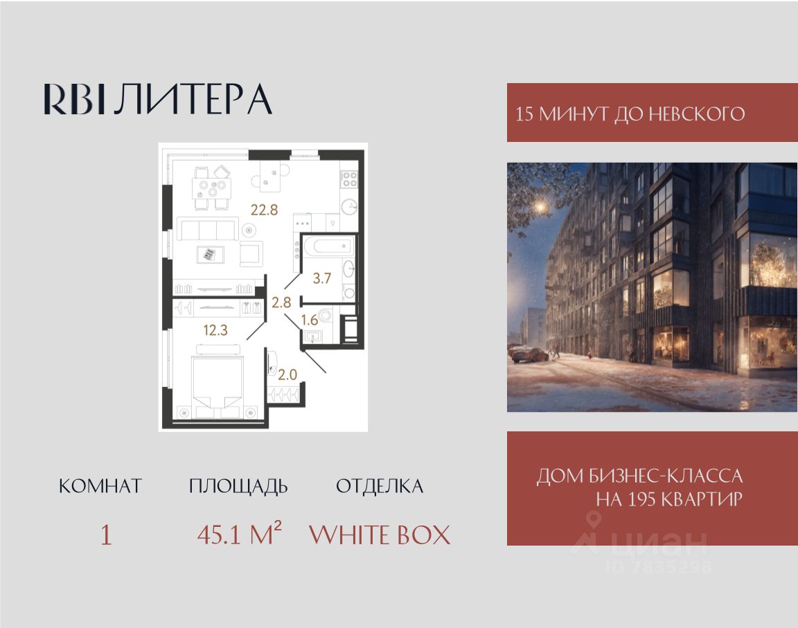 Клубный дом "Литера" от RBI. Новая "Литера" вашей жизни Камерный проект бизнес-класса на 195 квартир строится в 6 минутах от метро "Елизаровская" в непосредственной близости от исторического и делового центра Петербурга. Дом располагается в 700 м от набережной Невы по Большому Смоленскому проспекту: встречать рассветы и провожать закаты, наслаждаясь захватывающей панорамой города и зелёным окружением Невского района, можно из окон собственной квартиры! До Московского вокзала и центральной части Невского проспекта — 15 минут с учётом пешей прогулки до "Елизаровской" от дома. Добраться на автомобиле можно за то же время. До аэропорта "Пулково" 23 км. Дом состоит из двух 12-этажных секций, которые располагаются друг напротив друга, и ещё двух 8-этажных. Вместе секции образуют букву "Л" — форма дома отсылает к его названию. Планировки — от студий до просторных евро-четырёхкомнатных. Площадь квартир — от 24 до 121 м², высота потолков на типовых этажах — 2,8 м. На верхних этажах располагаются квартиры с террасами. Для романтиков — квартиры с эркерами. Для ценителей функциональных планировок — квартиры с выделенной рабочей зоной кухни и большой гостиной-столовой, планировки с мастер-спальнями и гардеробными. Ритмичную архитектуру в стиле лофт дополняют характерные "литеры" эркеров. Основной объём внешних фасадов из красного кирпича обеспечивается за счёт фламандской 3D-кладки и декоративных рустов. Со двора фасады выполнены в светлых тонах — чтобы усилить ощущение простора и безопасности. Единая дизайн-концепция продолжается в лобби дома. Сочетание тёплого кирпича с холодным металлом и стеклом создаёт харизматичное, брутальное настроение интерьера парадной группы. Чёткость вертикальных объёмов смягчается округлыми формами стойки ресепшн и декоративных куртин, а большие витражные окна создают иллюзию бесконечности пространства. Придать мыслям стройную форму можно будет в специально оборудованной зоне коворкинга только для жителей. Здесь же в лобби со свободным Wi-Fi появится зона ожидания для гостей и уникальный арт-объект от Владимира Абиха. Диптих из объёмных оттисков друг друга при наложении образует единое целое и запечатывает в себе фразу "Между нами". Эта инсталляция — метафора общности между нами, воплощение в искусстве объективной истины о том, что хотя вокруг много людей, лишь с немногими ощущаешь неподдельную связь и самого себя кем-то цельным. Вход на приватную территорию — по электронному ключу бесконтактного доступа. Во дворе высадят взрослые деревья и цветущие растения, оборудуют зону для занятий спортом, места отдыха для взрослых и экологичную детскую площадку с развивающими элементами для малышей и подростков. Двор без машин — можно отпускать детей на прогулки и не переживать за их безопасность. Для жителей оборудуют тёплый подземный паркинг, велопарковки и колясочные. На охраняемой территории у дома появится гостевая стоянка. Дом "Литера". Для авторов своей жизни