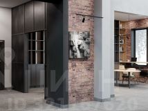 Единая дизайн-концепция продолжается в лобби дома. Сочетание тёплого кирпича с холодным металлом и стеклом создаёт харизматичное, брутальное настроение интерьера парадной группы. Чёткость вертикальных объёмов смягчается округлыми формами стойки ресепшн и декоративных куртин, а большие витражные окна создают иллюзию бесконечности пространства.