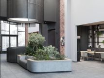 Единая дизайн-концепция продолжается в лобби дома. Сочетание тёплого кирпича с холодным металлом и стеклом создаёт харизматичное, брутальное настроение интерьера парадной группы. Чёткость вертикальных объёмов смягчается округлыми формами стойки ресепшн и декоративных куртин, а большие витражные окна создают иллюзию бесконечности пространства.