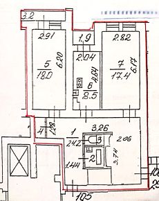• 3 изолированные спальни: - 18 кв.м. ( с застеклённой лоджией 3,2 кв.м.) - 17,4 кв.м. (без балкона) - 8,5 кв.м. (с застеклённой лоджией 1,9 кв.м.) Это кухня (по тех плану), Сейчас это помещение переделано в комнату.