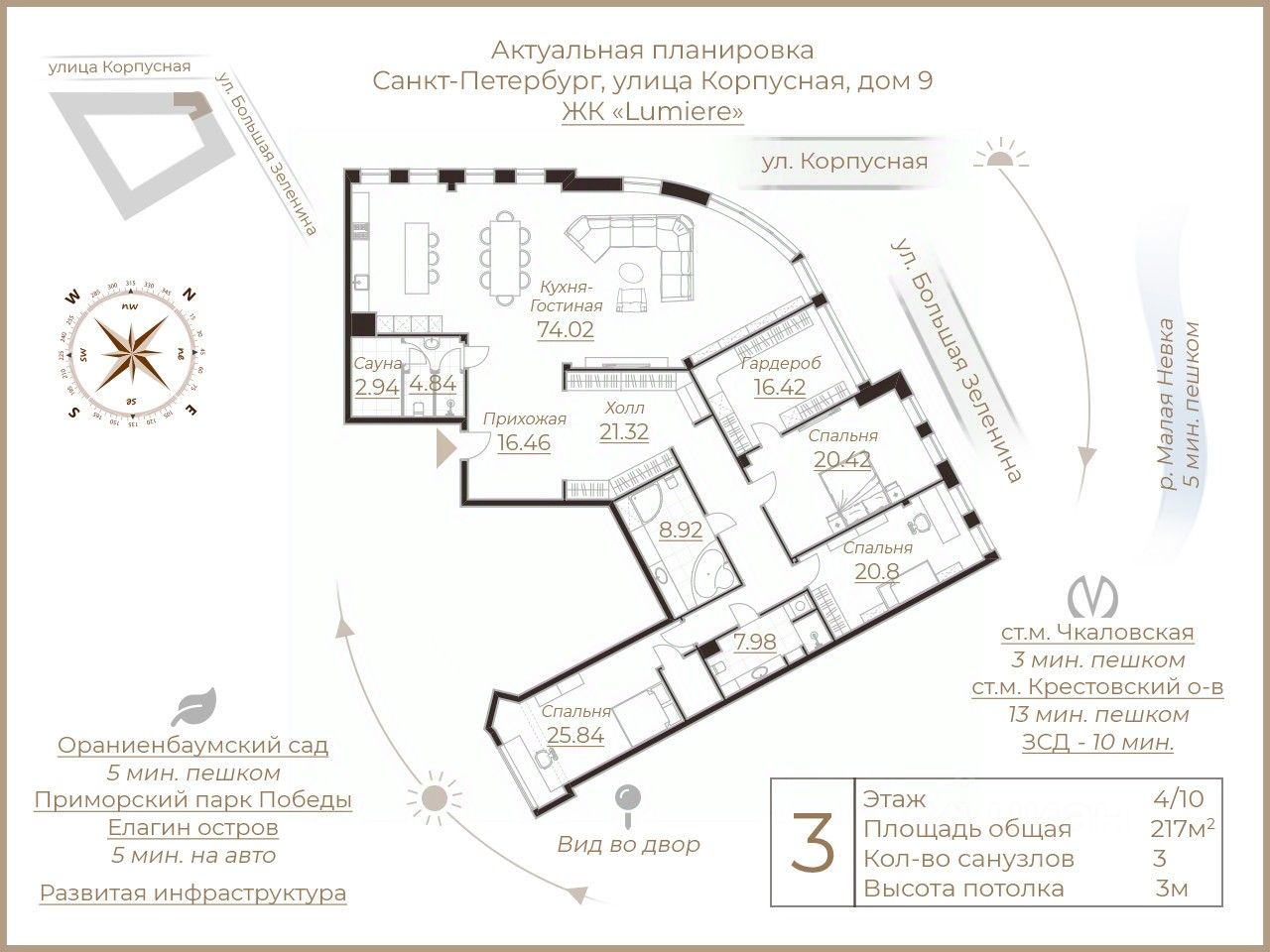 Арт. 69650370 Предлагаем Вашему вниманию уникальную квартиру в самом сердце Петроградского района, в современном доме ЖК "Lumiere" в непосредственной близости парковых зон Крестовского и Каменного островов. Просторная двухсторонняя квартира, расположена на 4 этаже, панорамные окна которой выходят на улицу.