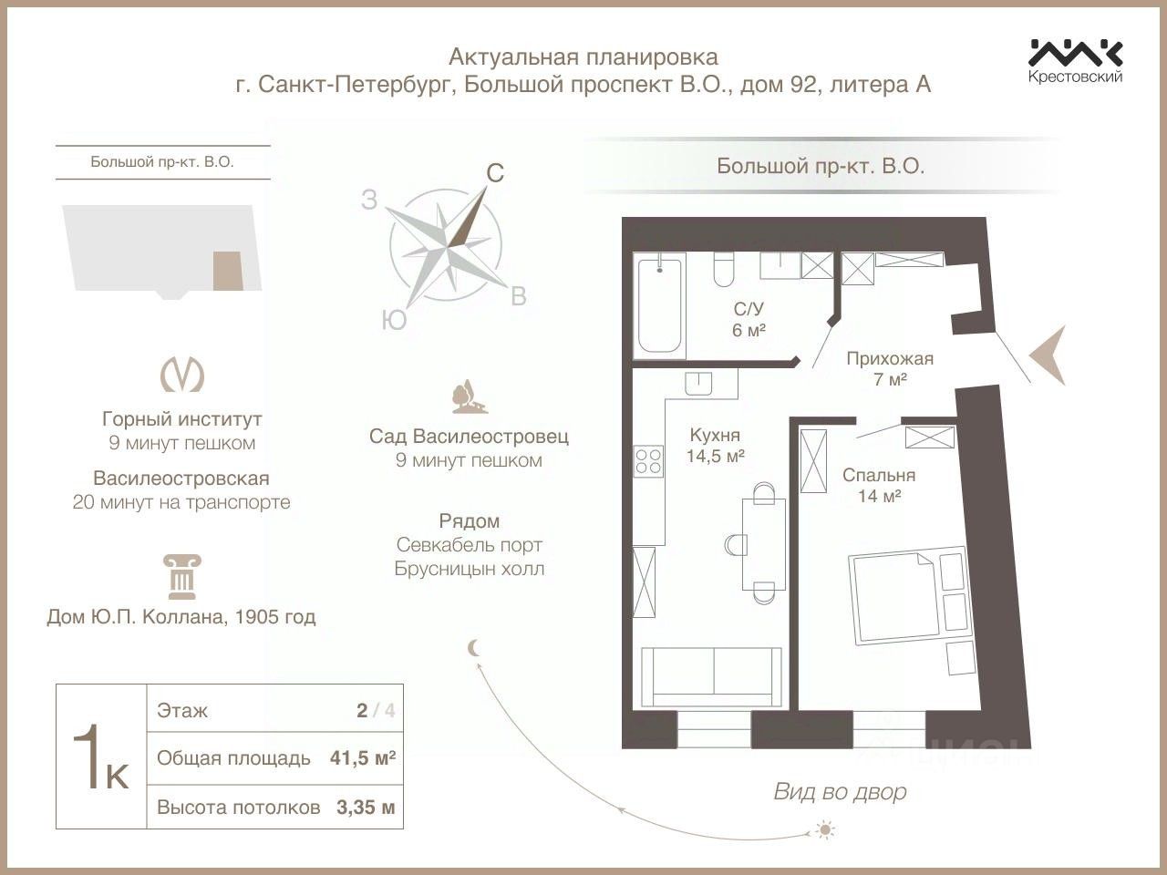 Удобная локация: до метро "Горный институт" 9 минут пешком, в шаговой доступности находятся креативные кластеры Севкабель Порт и Брусницын, а также сад Василеостровец. Рядом есть магазины, рестораны, фитнес-клубы, школы, детские сады, медцентры и всё необходимое для комфортной жизни.