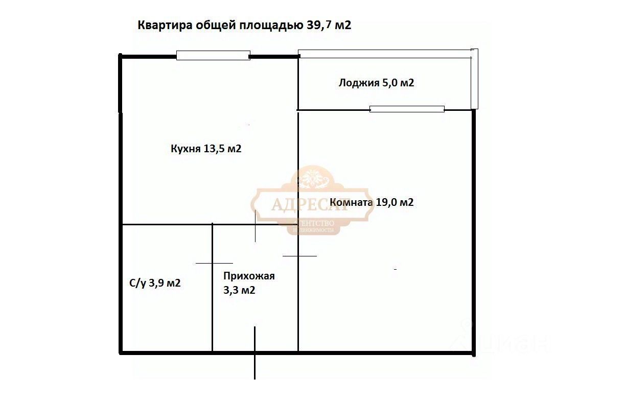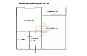 Квартира однокомнатная, общей площадью 39,7 м2, из которых комната - 19,0 м2, кухня - 13,5 м2. Квартира расположена на 8 этаже 19 этажного дома.