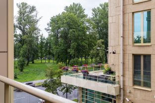 Потолки 3,30, панорамные окна в пол, вид на красивый зеленый двор с туями, не на шумную дорогу.