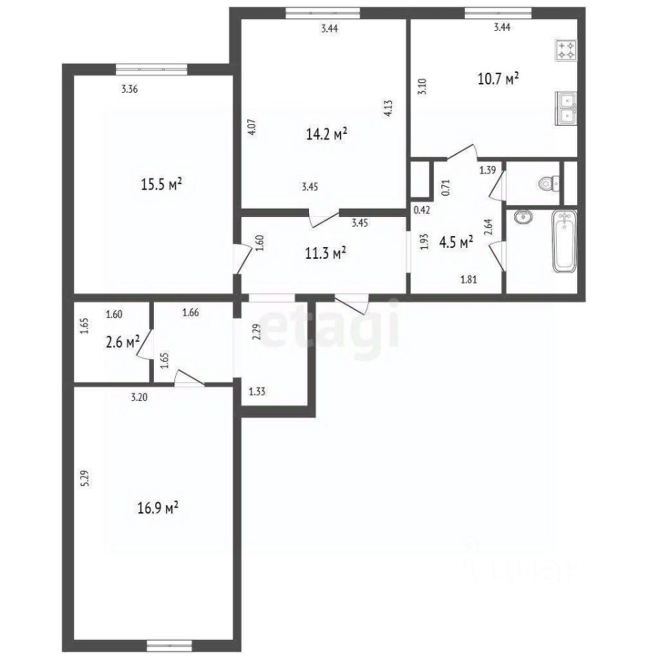 Просторные комнаты: 16,9 ; 15,5 и 14,2 кв.м.