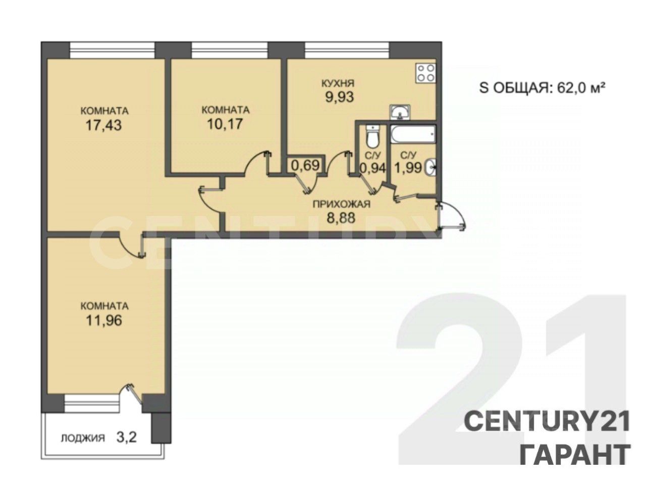 Общая площадь квартиры 62 кв.м + лоджия 3,2 кв.м.