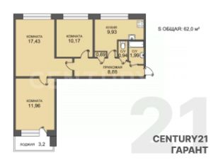 Площадь кухни 10 кв.м, комнаты 12+17,43+10,17.