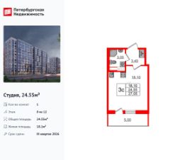 Удобная, классическая, функциональная европланировка, просторная прихожая 3.4 м². Общая площадь студии - 24.55 м², жилая 18.1 м², высота потолка 2.77 м.