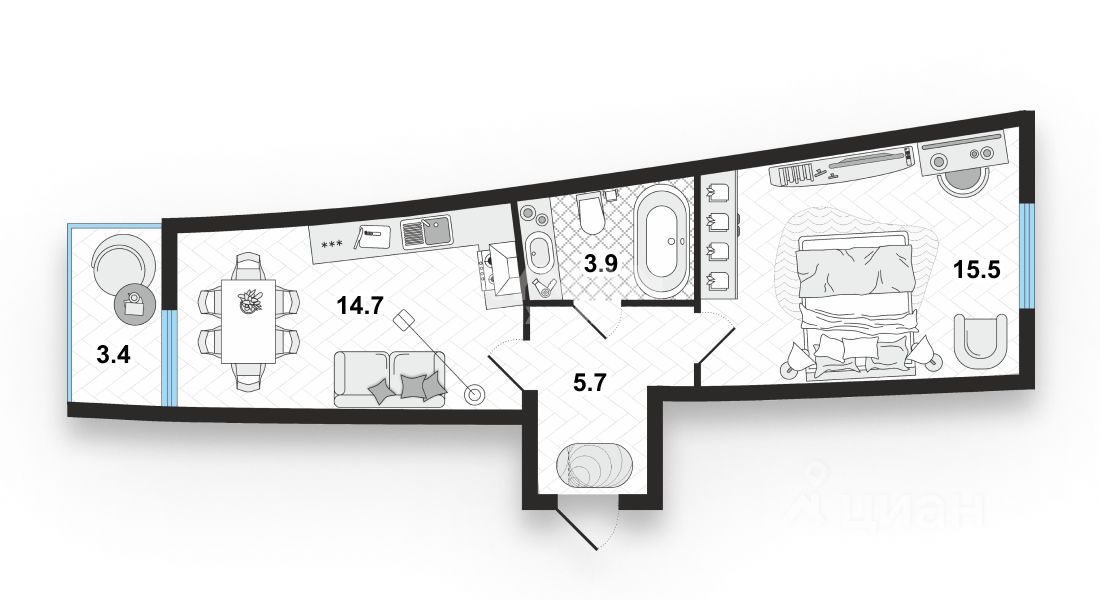 Просторная, светлая квартира с окнами на 2 стороны. Действительно комфортная планировка: кухня-гостиная 14,8 м2 с выходом на просторную лоджию и комната 15,7 м2 ! :)