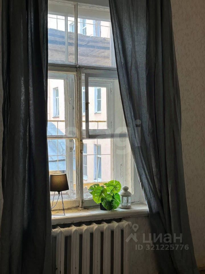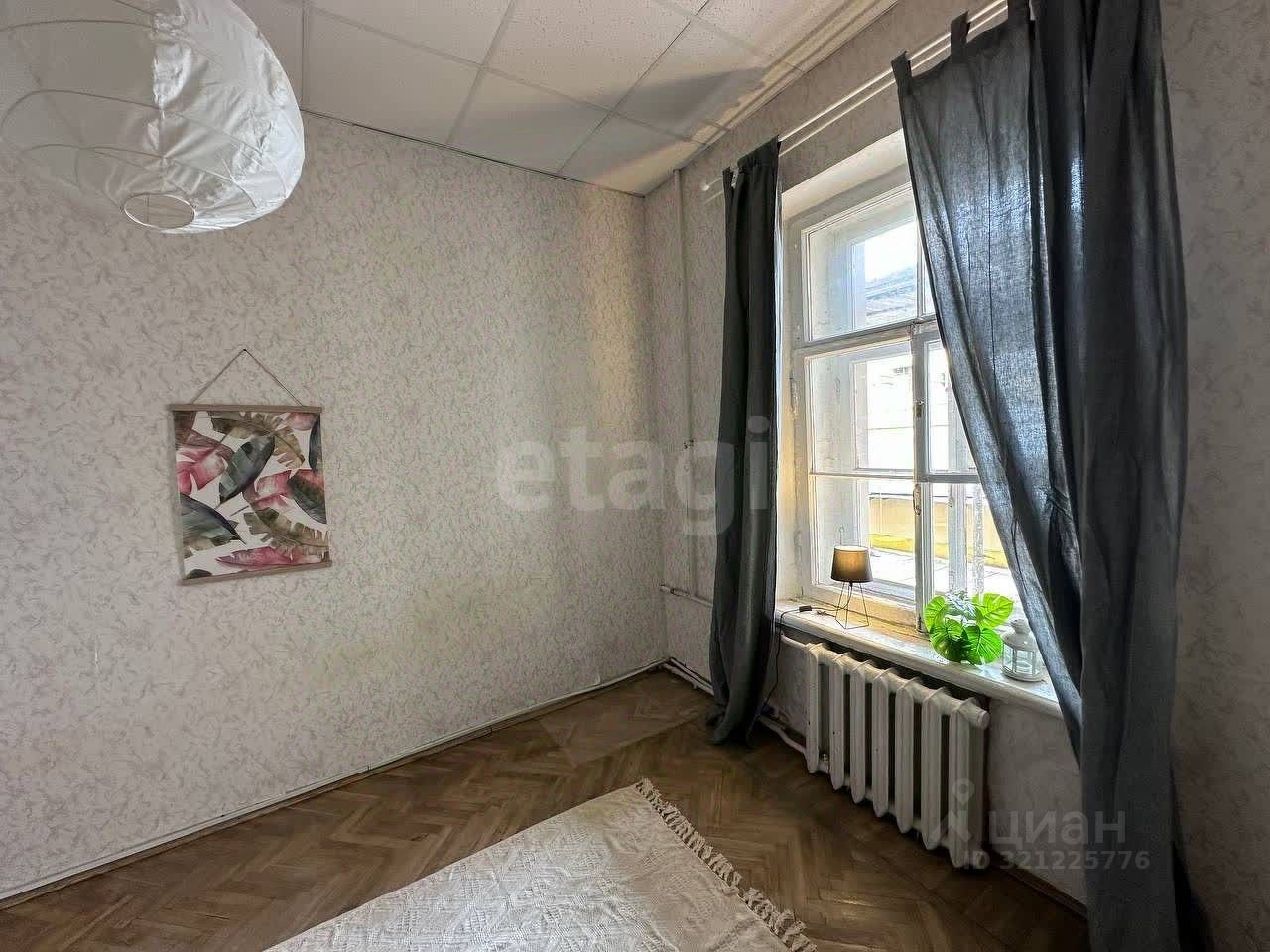 Комната — 11 кв.м. в шестикомнатной квартире, с деревянными окнами, выходят во двор — тихо и спокойно.