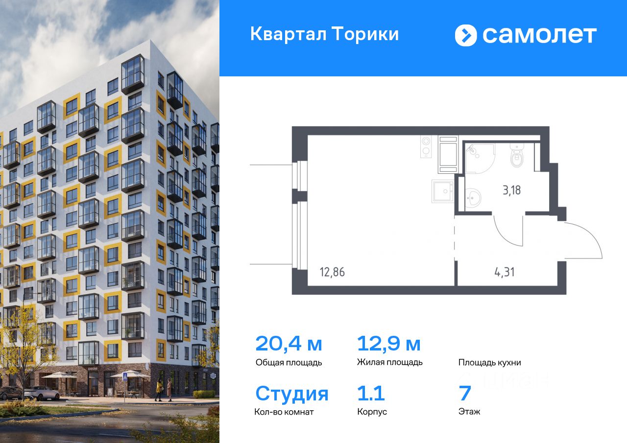 Строим кварталы для жизни с заботой о будущем. Предлагается квартира студия комфорт-класса 20,35 кв.м в корпусе 1.1 на 7 этаже, в ЖК "Квартал Торики"