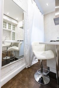 Отдельная изюминка нашей квартиры — это романтичная территория спальни (16 м.кв.), зонированная ударопрочным стеклом и молочно-белыми портьерами с гламурными нежными стразами))