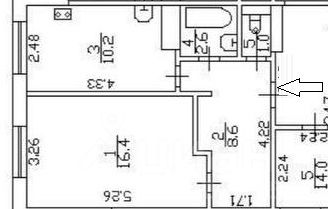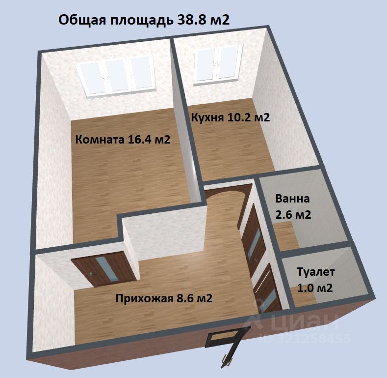 Общая площадь 38.8 м2., комната 16.4 м2, кухня 10.2 м2, просторная прихожая 8.6 м2. Санузел раздельный.
