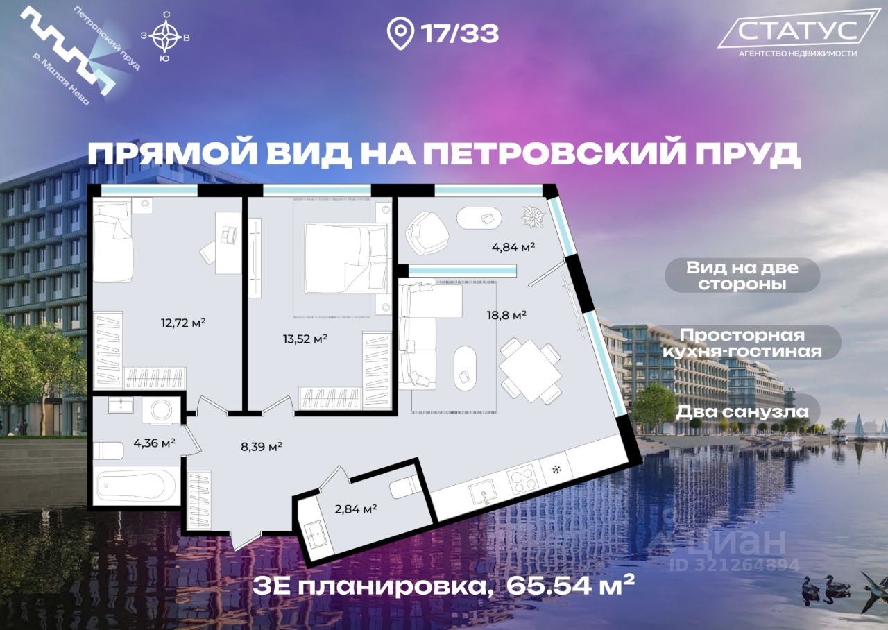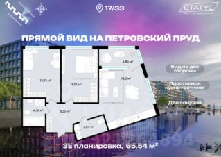 Прямой вид на Петровский пруд, грамотная планировка с двумя спальнями и просторной кухней-гостиной, потолки 3,3 метра и ощущение масштаба в каждом помещении.