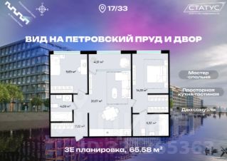 Планировка с мастер-спальней, двумя санузлами и гардеробной. Панорамный вид на Петровский пруд и благоустроенный двор, потолки 3,3 м и ощущение настоящего пространства.