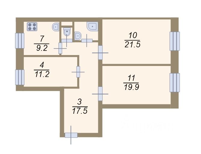 Комнаты расположены максимально комфортно: кухня 9,2 кв.м. правильной квадратной формы, 3 изoлировaнныe комнаты 21,5 кв.м. + 19,9 кв.м. + 11,2 кв.м., большой холл - 17,5 кв.м., раздельный санузел (3+0,9 кв.м).