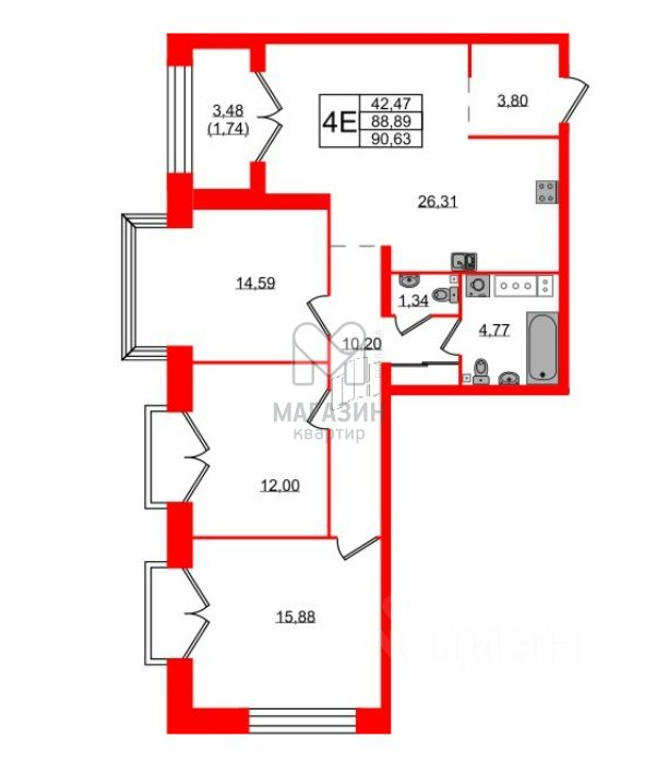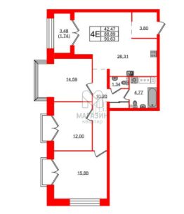 Три изолированные спальни 15,9 / 14,6 / 12,0 м²