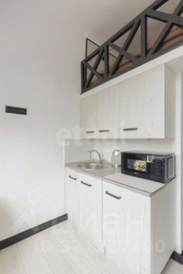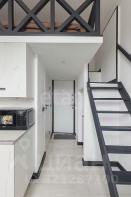 Уютная студия с свежим ремонтом в современном стиле готова к заезду: есть вся необходимая мебель и техника. Особенность удобная двухуровневая организация пространства: на втором ярусе расположена кровать. Внизу зона гостиной и кухни, ванная комната.