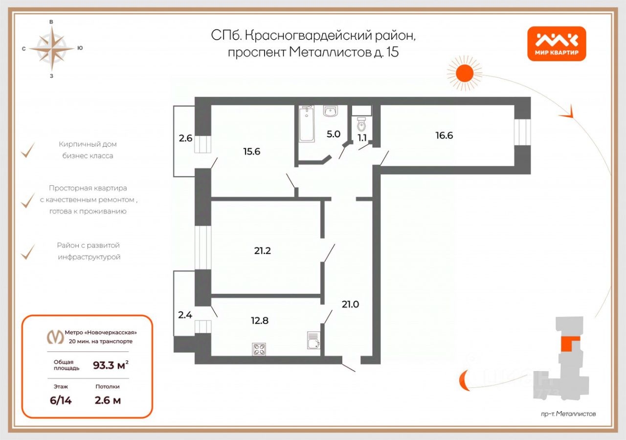 Простор и свет: 93,3 м2 общей площади, три изолированные комнаты (21,2 + 15,6 + 16,6 м2) места хватит для каждого члена семьи!