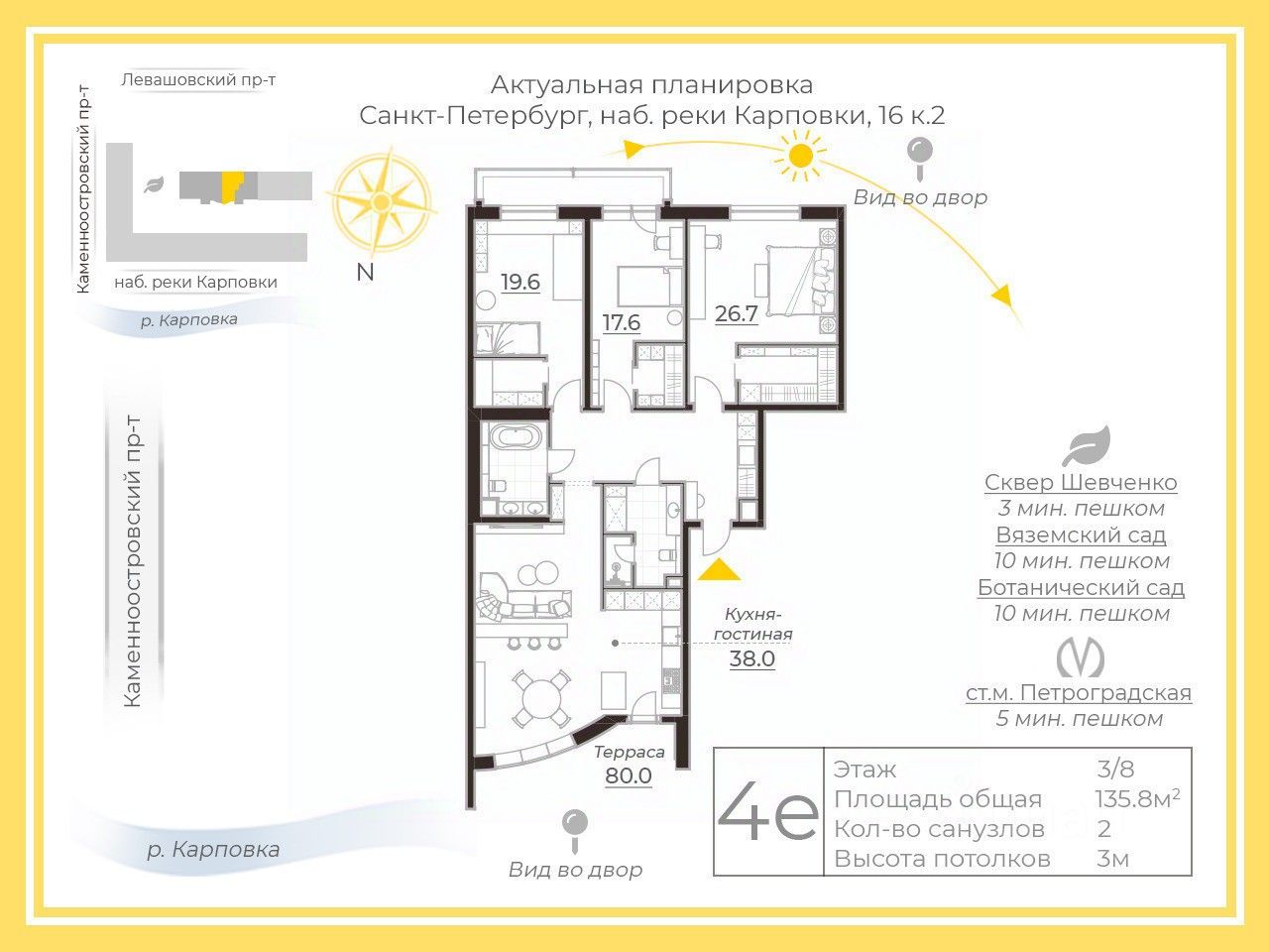 Ремонт, который закончили совсем недавно. Эргономика, планировочные и дизайнерские решения можно назвать бескомпромиссными. Три объемные спальни, каждая из которых со своей гардеробной. Два санузла: один с ванной, второй с душевой системой и постирочной. И место, где Вы будете проводить большую часть времени: кухня-гостиная с зонированной зоной готовки, столовой и местом отдыха, где можно расположиться на диване. Это не все, так как еще есть выход на 80метровую террасу.