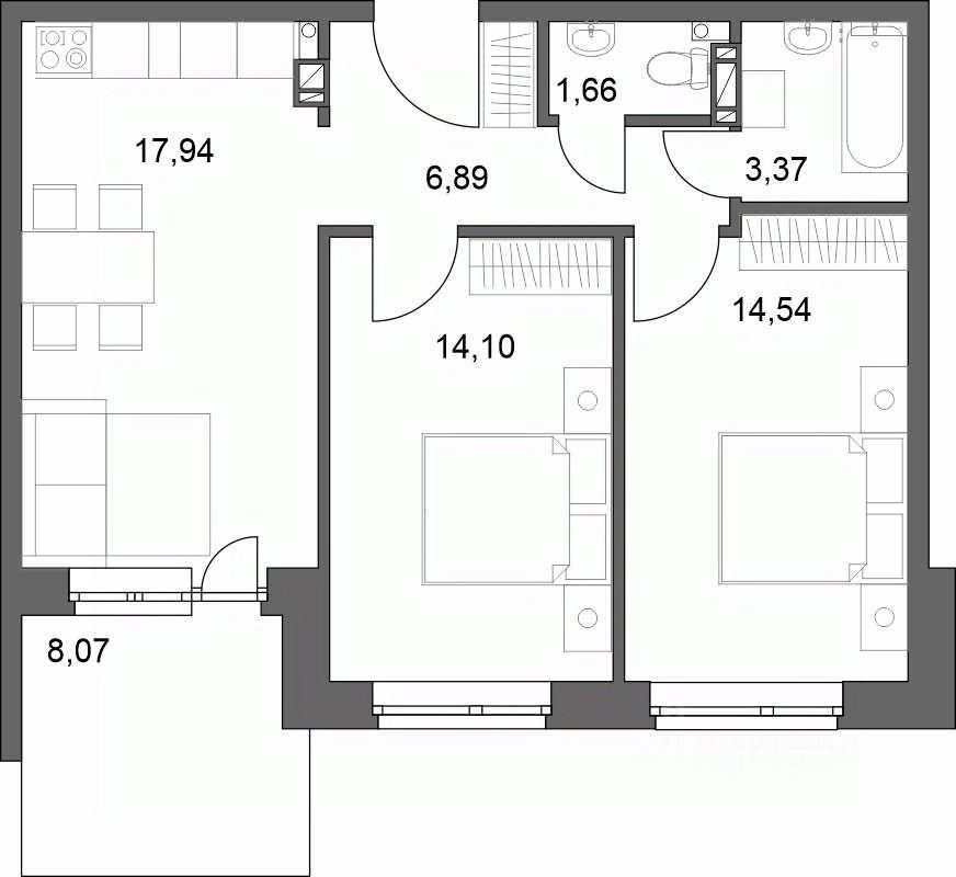 Предлагается к продаже Евро 3х комнатная квартира 60.92 кв.м с просторной кухней-гостиной 17.94 кв.м на первом этаже трехэтажного дома.