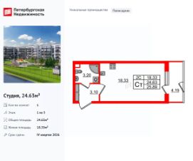 Уникальная, функциональная европланировка, вместительная прихожая 3.1 м². Общая площадь студии - 24.63 м², жилая 18.33 м², высота потолка 2.77 м.