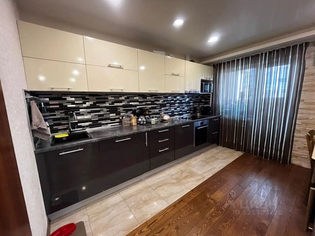 - На полу паркетная доска. Керамогранит на кухне.