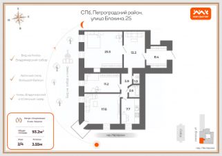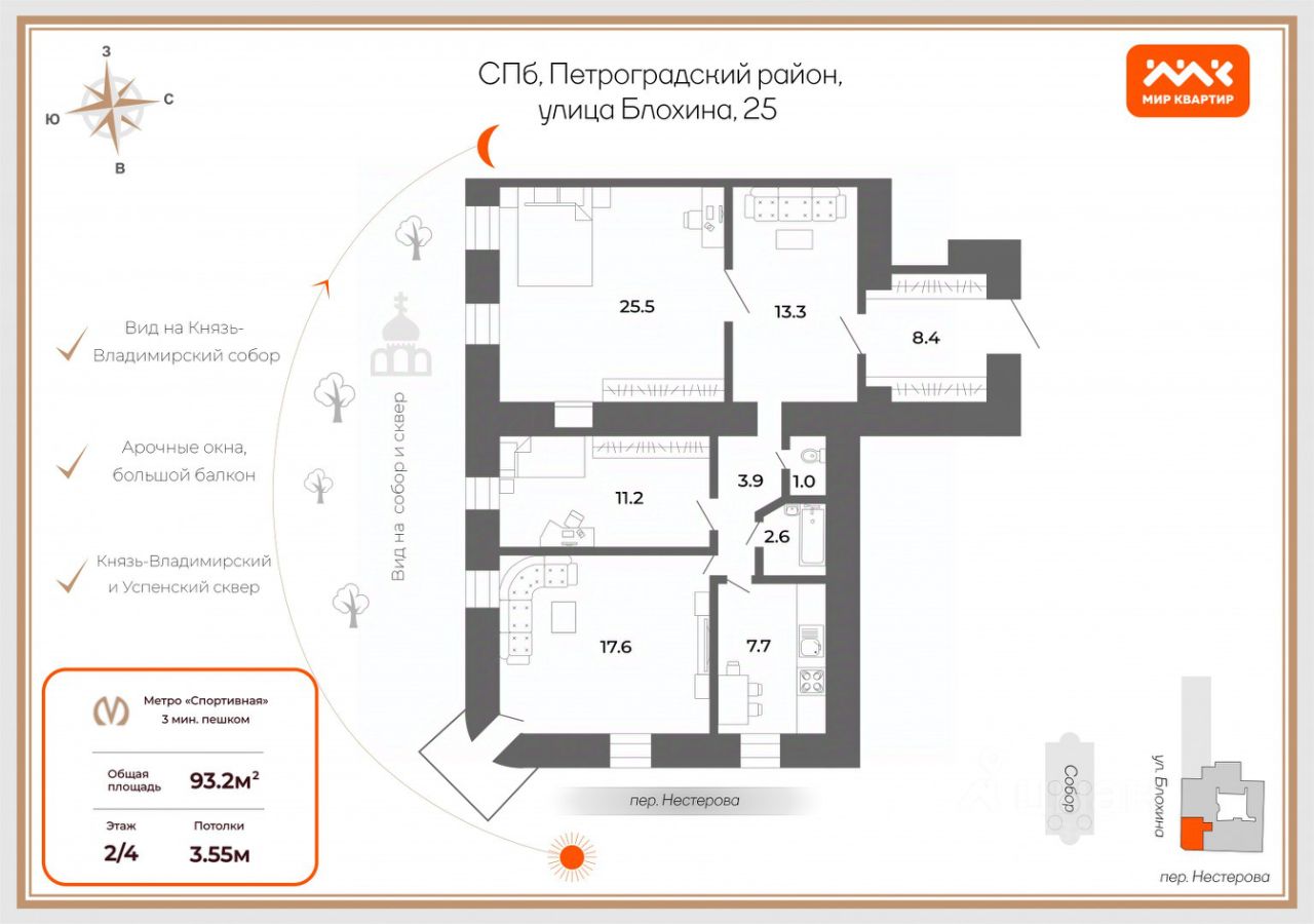 Из арочных окон квартиры открывается прямой вид на Князь-Владимирский собор и одноимённый сквер, размер балкона позволяет не только на него выйти, но и позавтракать, а при желании даже отдохнуть.