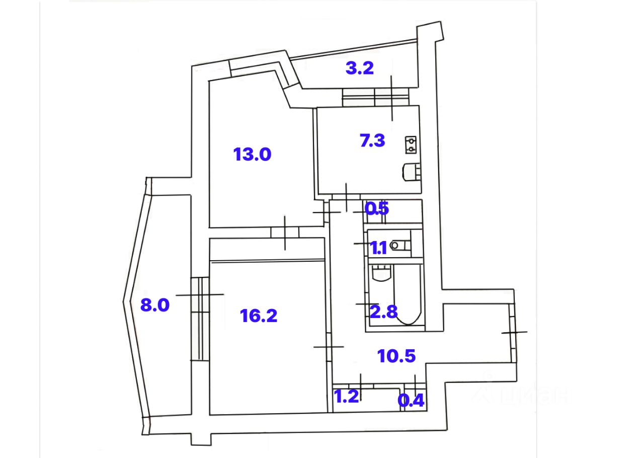 Уютная кухня-столовая 7.3 кв.м. с выходом на остекленную лоджию, которая может служить дополнительным пространством для отдыха, хобби или хранения вещей. Две жилые комнаты: 13.0 кв.м. и 16.2 кв.м. с выходом на балкон. Большой балкон 8 кв.м. станет отличным местом для семейного отдыха и встреч с друзьями. Прихожая 10.5 кв.м. с местом под шкаф. Санузел раздельный.
