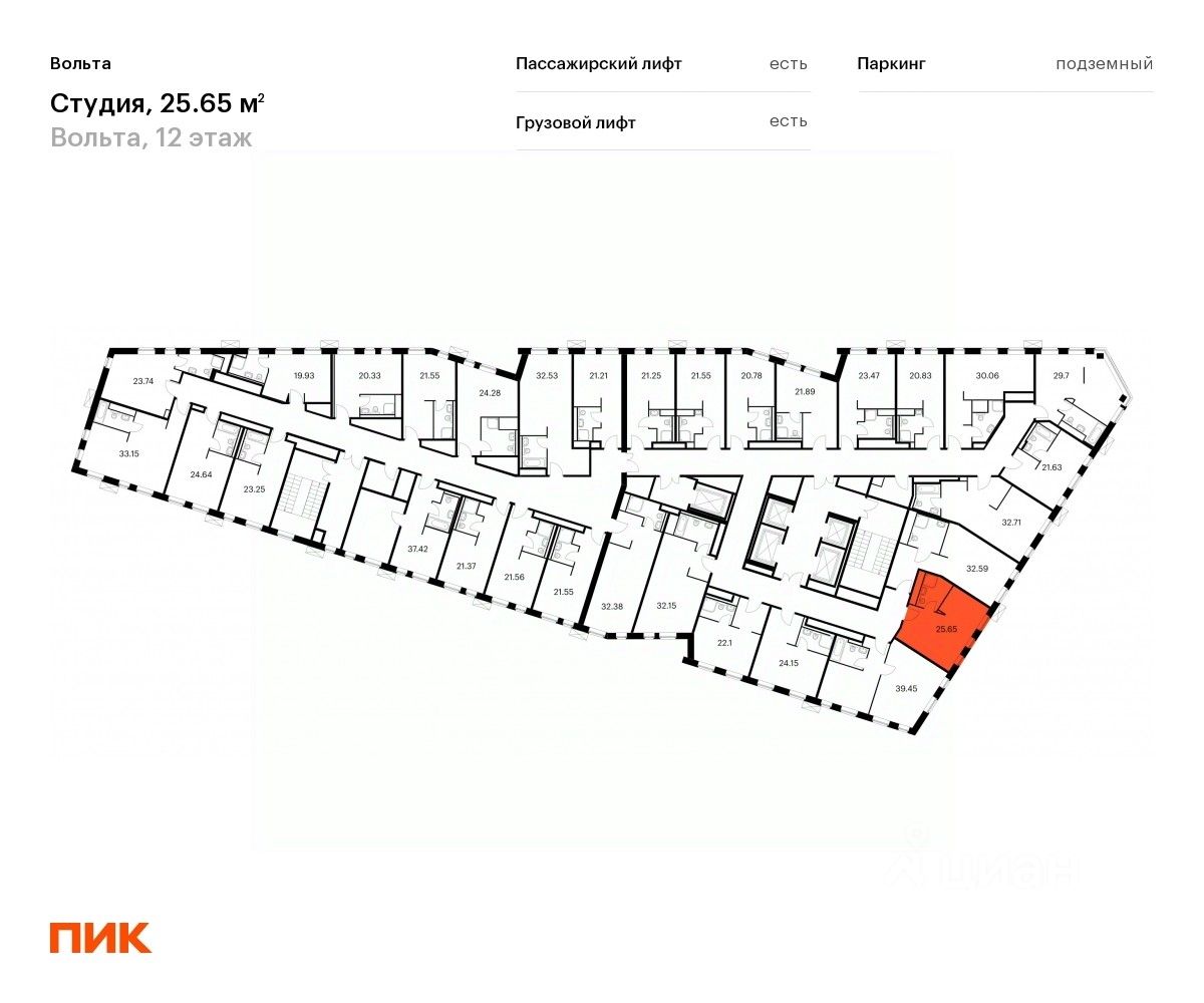 Продаются апартаменты-студия площадью 25,65 кв.м на 12 этаже 15 этажного дома (Вольта, Секция 1) проекта ПИК Вольта.
