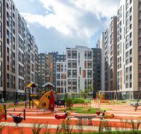Закрытый двор без машин с ландшафтным дизайном с современной детской и спортивной площадками, велопарковками.