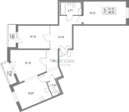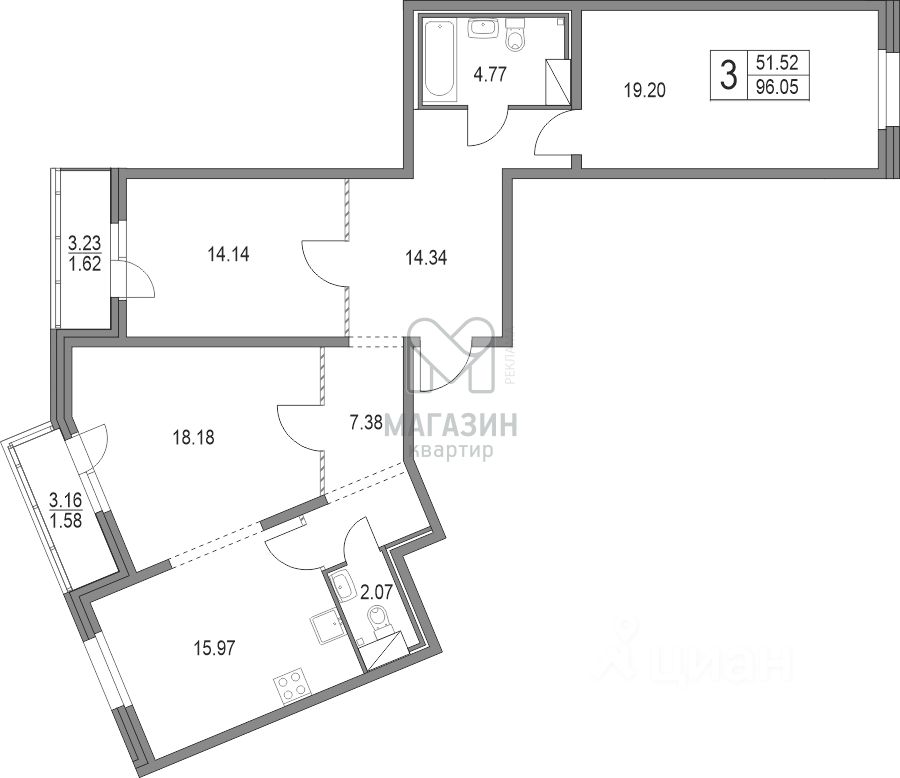Комнаты (изолированные): 18,18 м² • 14,14 м² • 19,2 м² — легко выделить родительскую и детскую/кабинет