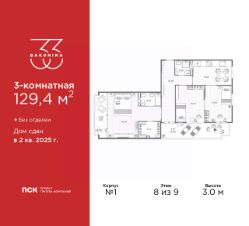Продается 3-комн. квартира от застройщика в ЖК "BAKUNINA 33" на 8 этаже. Квартира без отделки, новый собственник может сделать ремонт по индивидуальному дизайн-проекту. Общая площадь: 129.4 кв.м., жилая: 60.78 кв.м., площадь просторной кухни-столовой: 15.85 кв.м. Квартира - распашонка, без проходных комнат, окна выходят на paзные стороны дома. В квартире два балкона, два совмещенных санузла. Наличие террасы в квартире открывает возможность для обустройства дополнительной площади. Высота потолков 3.0 м.