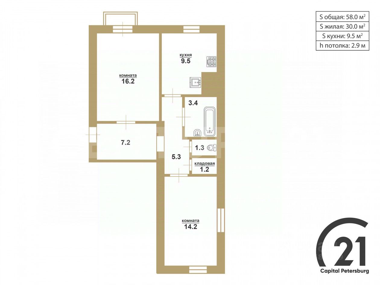 Обратите внимание на удобную планировку. Две изолированные комнаты 14,2 м2 и 16,2 м2.