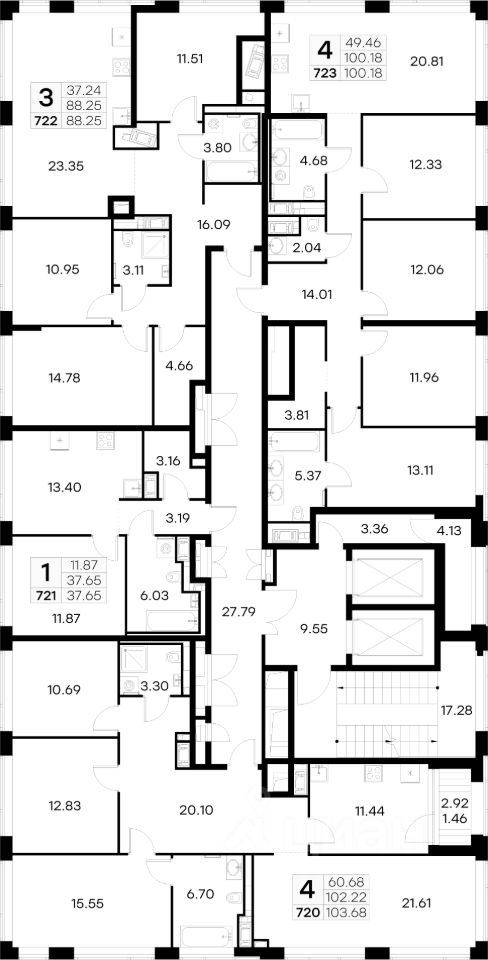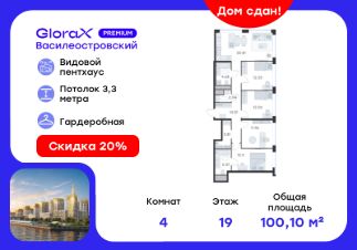 Продается 4-комн. квартира на 19-м этаже в сданном проекте премиум-класса GloraX Premium Василеостровский. Общая площадь лота составляет 100,18 кв. м, из которых 49,46 кв. м отведено под жилую и 20,81 кв. м под кухонную зону. Номер квартиры - 723