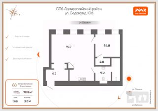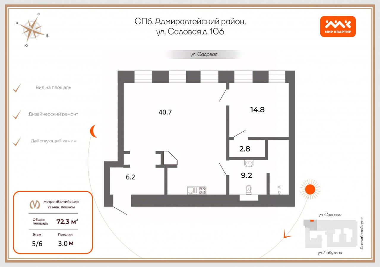 Арт. 114306629 Вашему вниманию предлагается по истине Петербургская 2-комнатная квартира с действующим камином, общей площадью 73.6 м2!