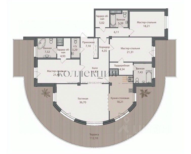 Знаменитая планировка-полукруг в ЖК "Привилегия" с трехсторонним обзором акватории Малой Невки, большими панорамными окнами и террасой 83 м2 по всему периметру квартиры. В квартире с открытой планировкой - 3 мастер-спальни, каждая со своей ванной комнатой и гардеробной, а также просторная гостиная 52 м2 и кухня-столовая 25 м2. При входе в квартиру есть также гостевой санузел.