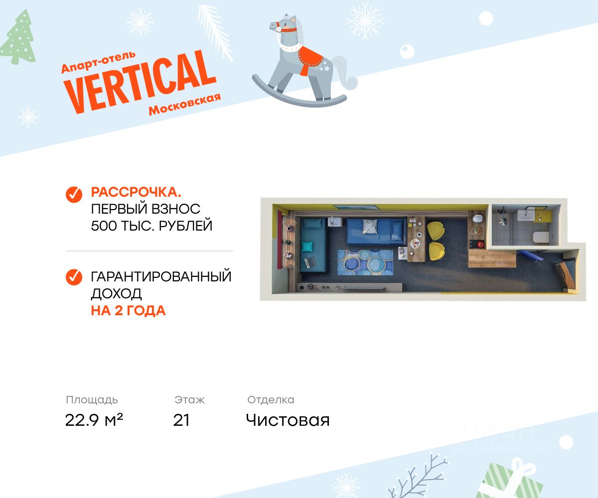 Продаются апартаменты 2114, общей площадью 22.90 м2, расположенные на 21 этаже, в 1 корпусе инновационного апарт-отеля Vertical Московская. Помещение сдается с чистовой отделкой, мебелью и техникой.