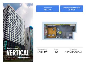 Продаются апартаменты 1033, общей площадью 17.81 м2, расположенные на 10 этаже, в 2 корпусе инновационного апарт-отеля Vertical Московская. Помещение сдается с чистовой отделкой, мебелью и техникой.