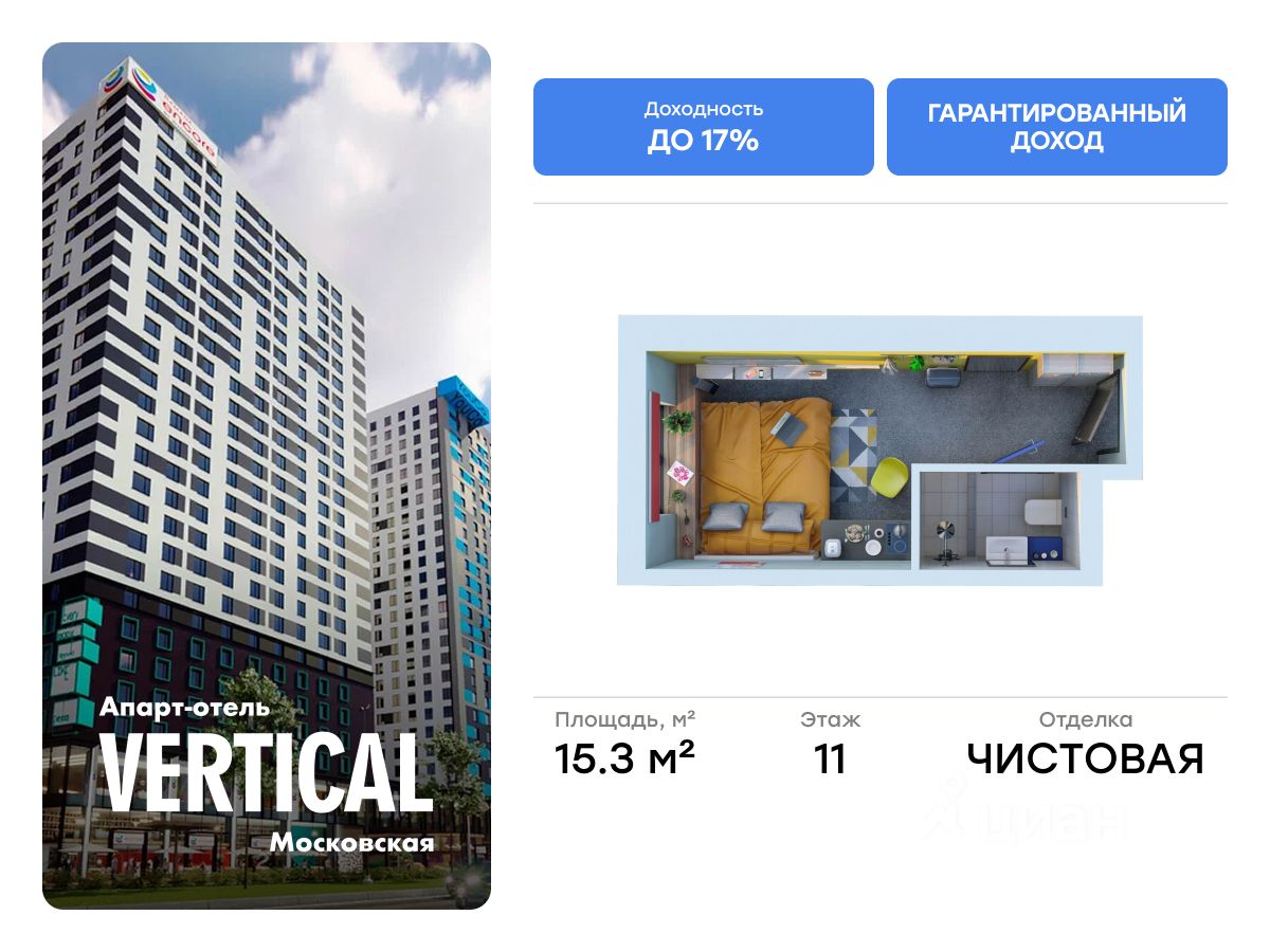 Продаются апартаменты 1103, общей площадью 15.30 м2, расположенные на 11 этаже, в 2 корпусе инновационного апарт-отеля Vertical Московская. Помещение сдается с чистовой отделкой, мебелью и техникой.