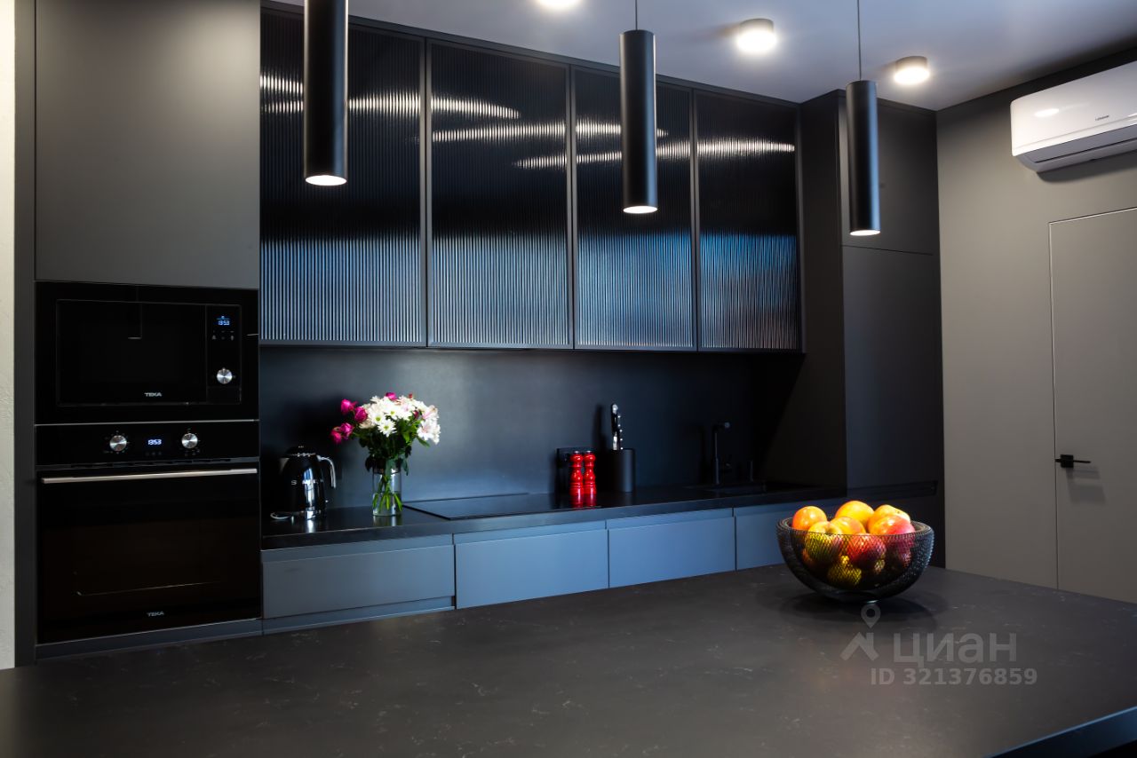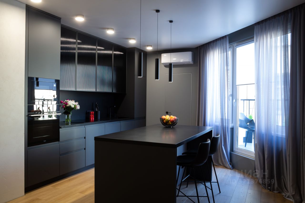 Кухня-гостиная с красивым балконом спроектирована для комфортного времяпрепровождения и приема гостей, оснащена современной бытовой техникой премиум-класса.
