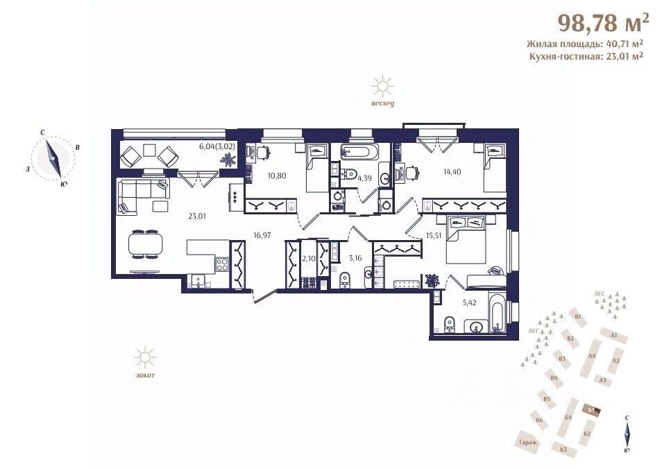 В ЖК бизнес-класса Ranta Residence нет студий: все квартиры имеют площадь от 36 м² до 99 м².